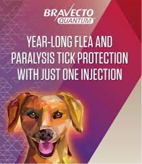 Bravecto Quantum (fluralaner for extended-release injectable suspension) is an FDA-approved flea and tick medication for dogs and puppies 6 months of age and older. It's a single injection that offers protection against fleas and ticks for an extended period, according to Merck Animal Health USA.