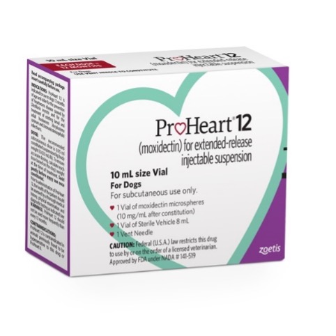 ProHeart 12: A year-long heartworm prevention option for dogs. ProHeart 12 (moxidectin) is an FDA-approved injectable medication for dogs 12 months of age and older that prevents heartworm disease for a full year. Heartworm disease, spread by mosquitoes, is a serious and potentially fatal illness where worms grow in a dog's heart and lungs.